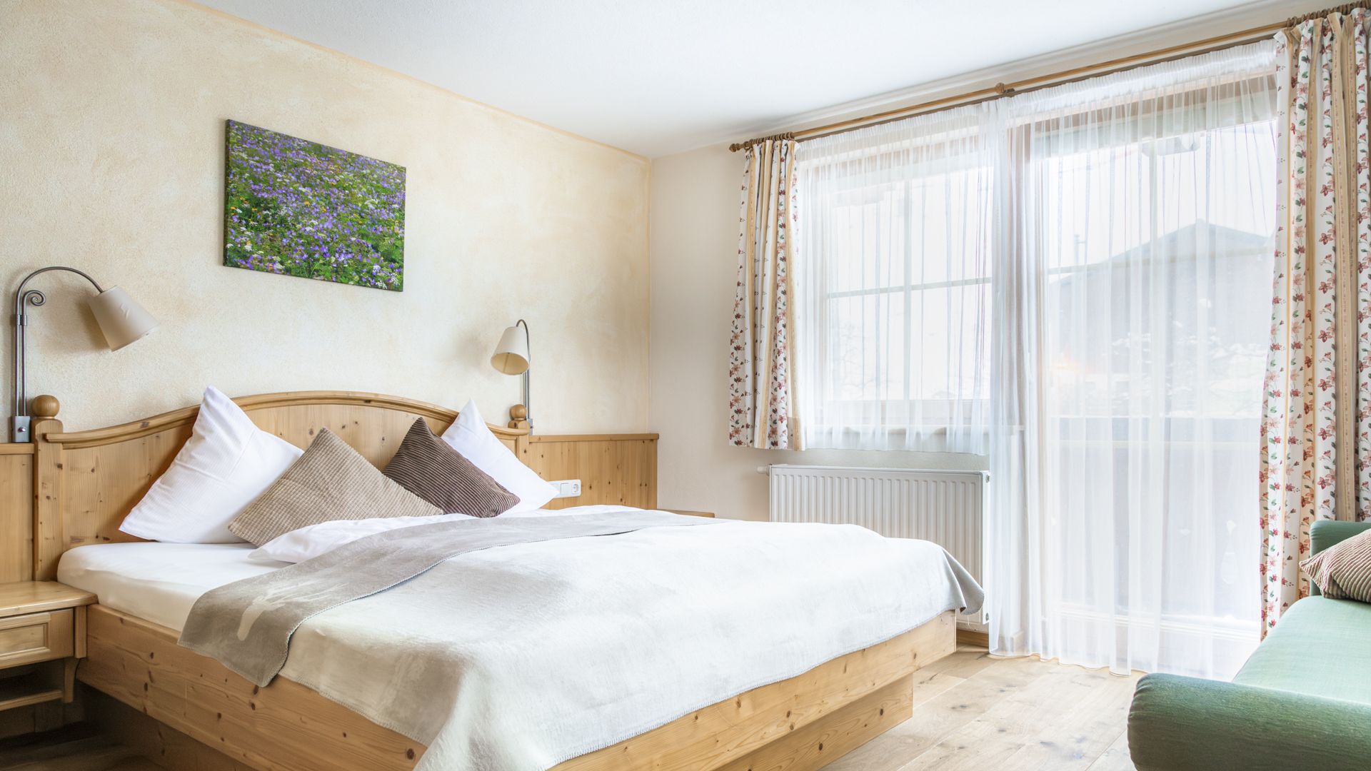 Unsere großzügige Ferienwohnung mit drei Schlafzimmern und zwei Balkone bietet viel Platz für Familien, die im Herzen des Großarltals echte Erholung suchen. Warme Holzelemente und freundliche Stoffe schaffen eine gemütliche Atmosphäre.